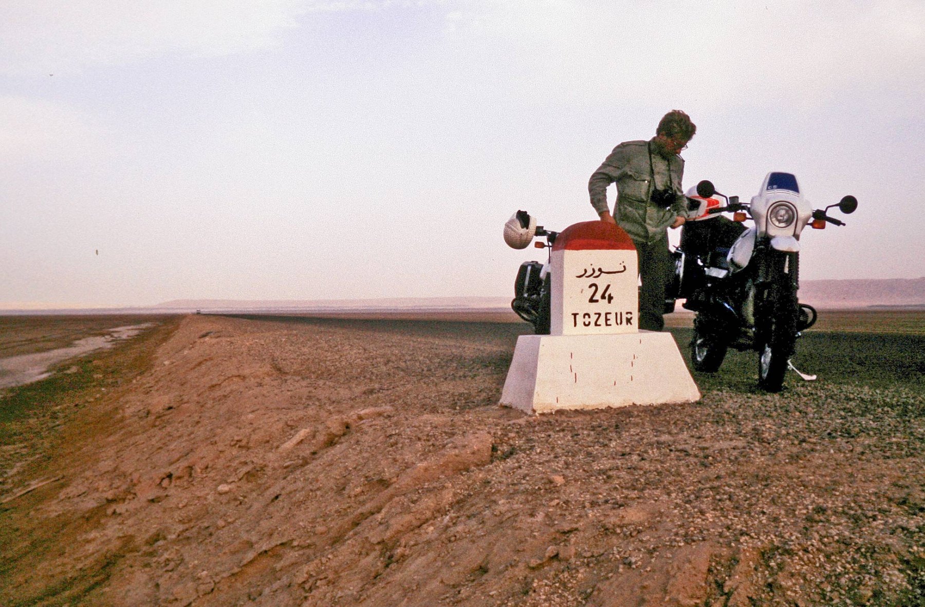 Fotogalerie Tunesien 1989 Chott el Djerid Bild 11 von 17 Kilometerlang führt die Straße als Damm über den ausgetrockneten Salzsee